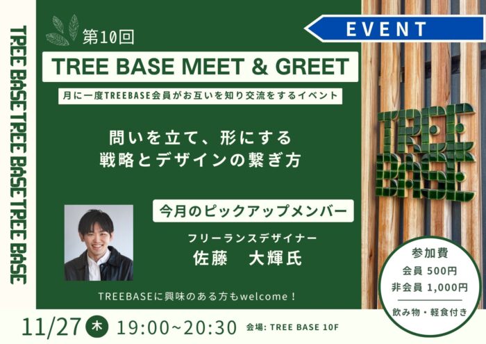 こんにちは。札幌シェアオフィスTREEBASEです。 「TREE BASE MEET&GREET」の開催予告です。 ■第10回 TREE BASE MEET & GREET 問いを立て、形にする 戦略とデザインの繋ぎ方 ・日時:11月27日(木)19:00~20:30 ・場所:TREE BASE 10F ・参加 […]