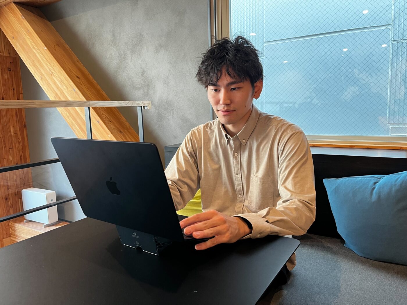 検索でTREEBASEを見つけて見学に来たところ、立地の良さと雰囲気の良さが決め手になりました。駅から近くアクセスがとても良いですし、内装も木の温かみがあって落ち着ける空間。家具や香りにもこだわりが感じられて、「ここなら自然体で働けそうだな」と感じました。